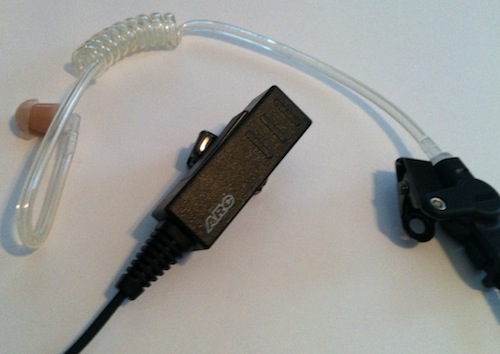 9 04 2012A lot of the work I do with big crews usually involves some sort of communication device, a walkie talkie if you will. And obviously you can’t have a PA coming through an open walkie saying, “I can’t find the c-47’s!” on an open set. So what is usually employed with a walkie system is a surveillance mic/ear piece. Observe in the image below: